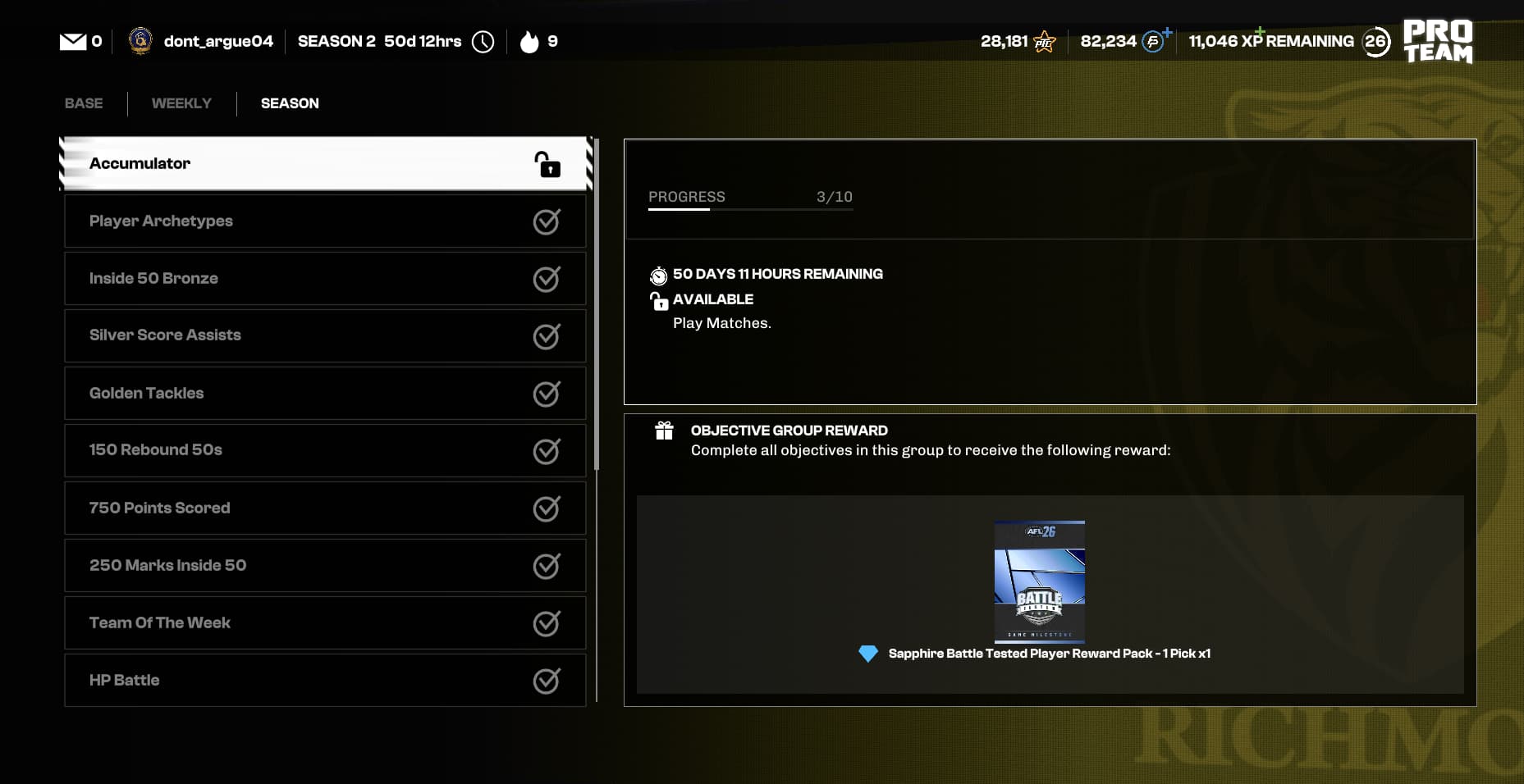 I’ve just knocked off all my weekly and Season objectives, Just need to chip away at the accumulator which is pretty tough 82\350 matches played.
