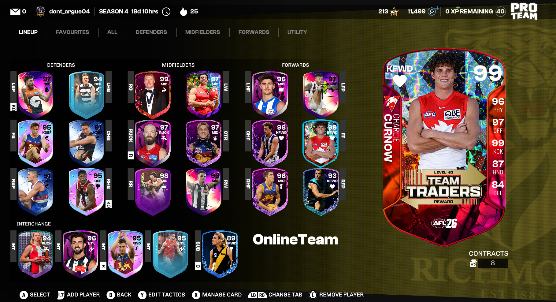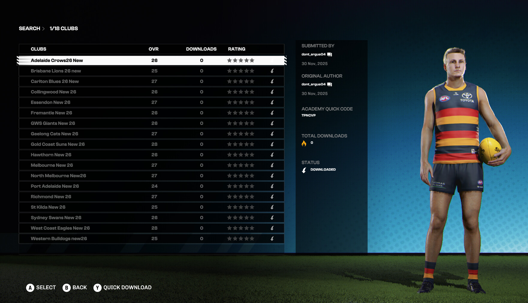 Good to see that pro team is unplayable for me. I canāt adjust any lineups as so no players appear for me in any of the player tabs. And my game keeps crashing. See ya AFL26. The glitches have officially become too much for me
