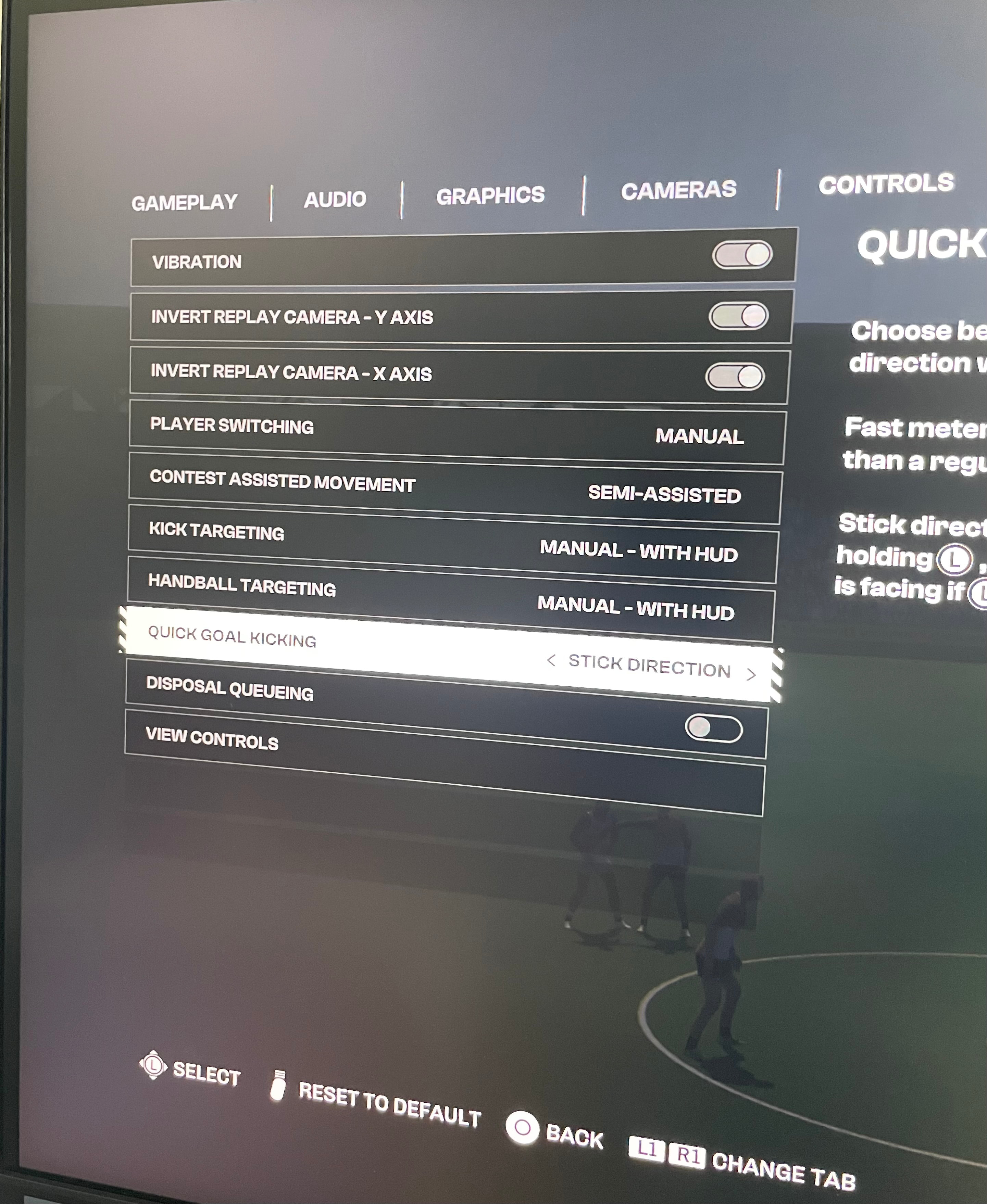 Currently the quick kick does have its disadvantages of lower kick power and obviously lack of accuracy cause you don’t know where you are aiming as. But in saying that I’ve been having so much more fun with trying to kick goals on the run using it even though I end up with a score of like 1/8/14 and losing. The one goal I get from it just feels damn good
