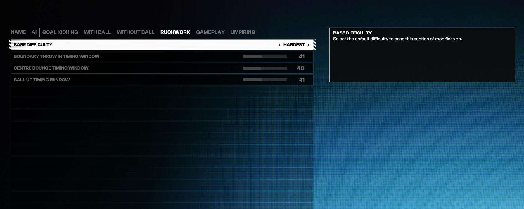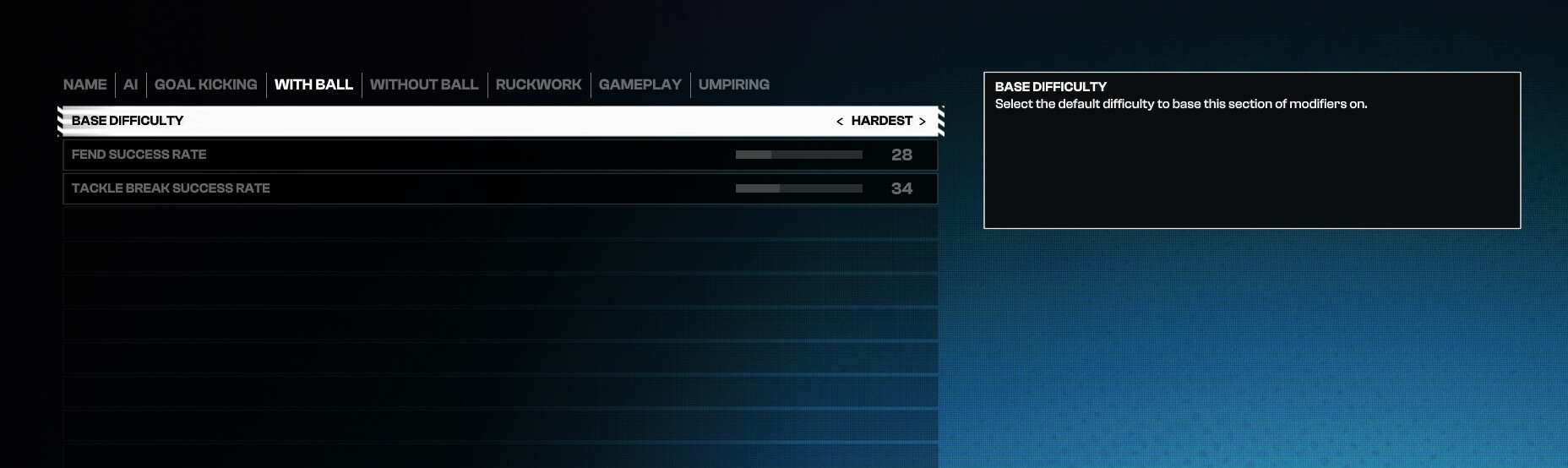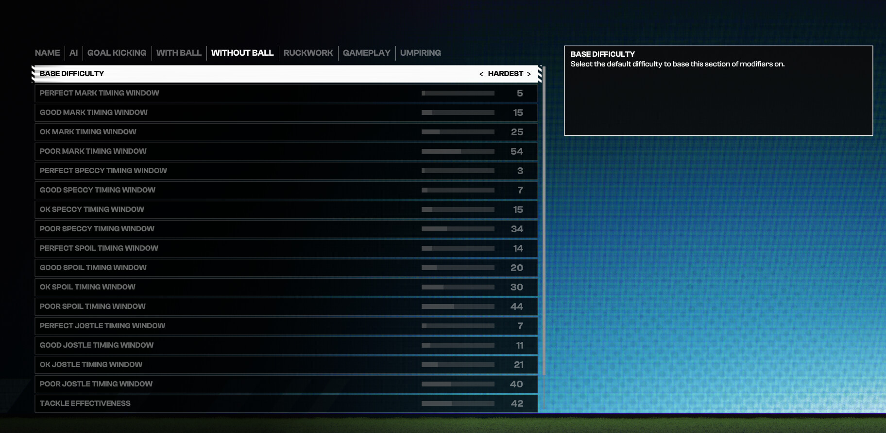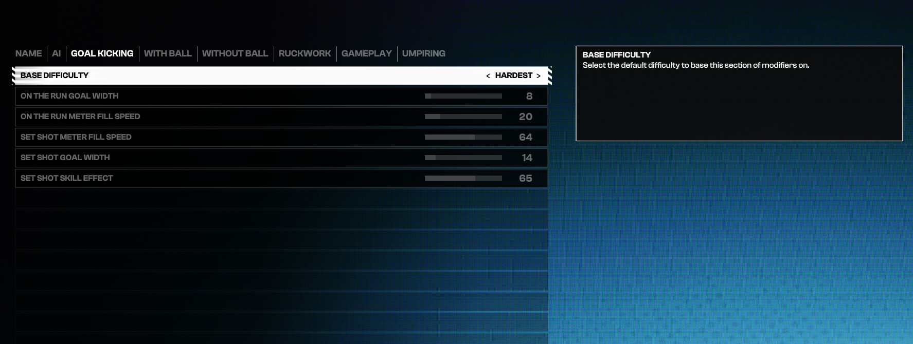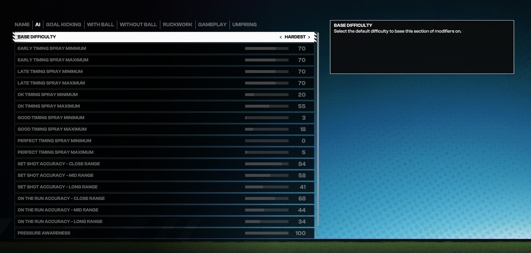 I am testing my sliders atm after the recent update and patch, once I have had the chance to run a few games and happy with what I see stat wise, I will post here, can’t give an exact timeframe. As for does it make the game hard, it makes it realistic to the norms of AFL in real life or close too. But that a very variable question as for some the game may just be too easy no matter how hard you make the custom sliders and vise versa may be too hard for others, but I will post here when ready and you can feel free to try them ![]()