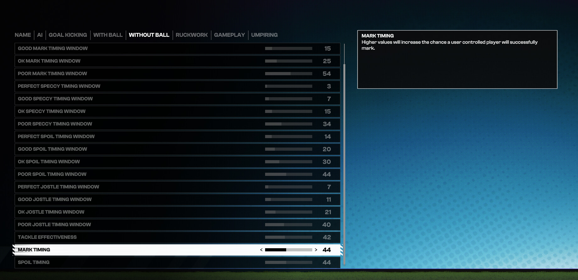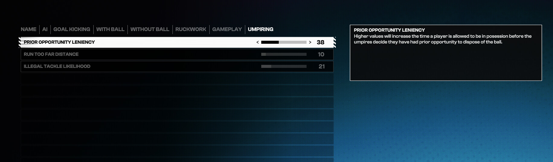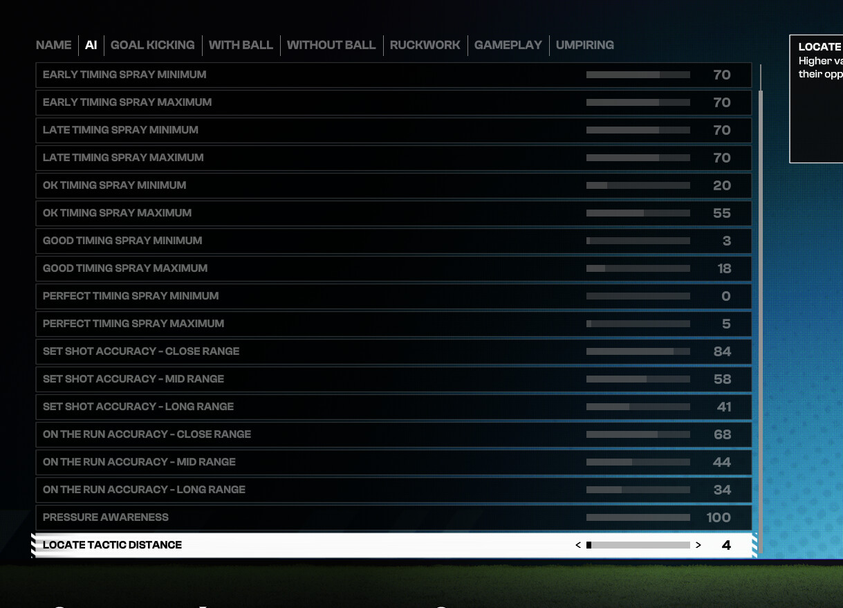 Alright I think i’ve nailed the sliders for a challenging gameplay and much better AI to play against, you will need to download the new Updated teams i’ve added with all new 2026 line ups the big change within each team tactics i’ve buffed everyones play style for play on, hand ball risk, kicking risk all to 80 this makes the AI react real quick to better options. IMO this is the best feeling i’ve had with player v Cpu