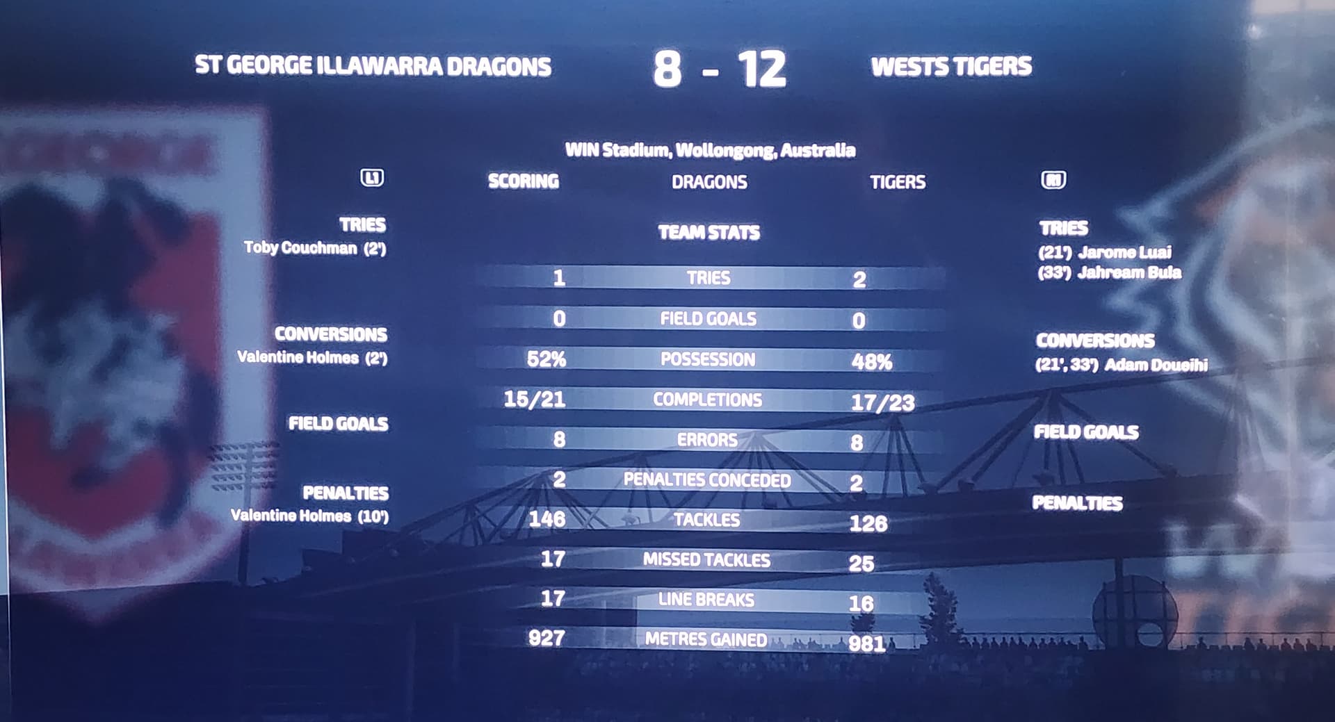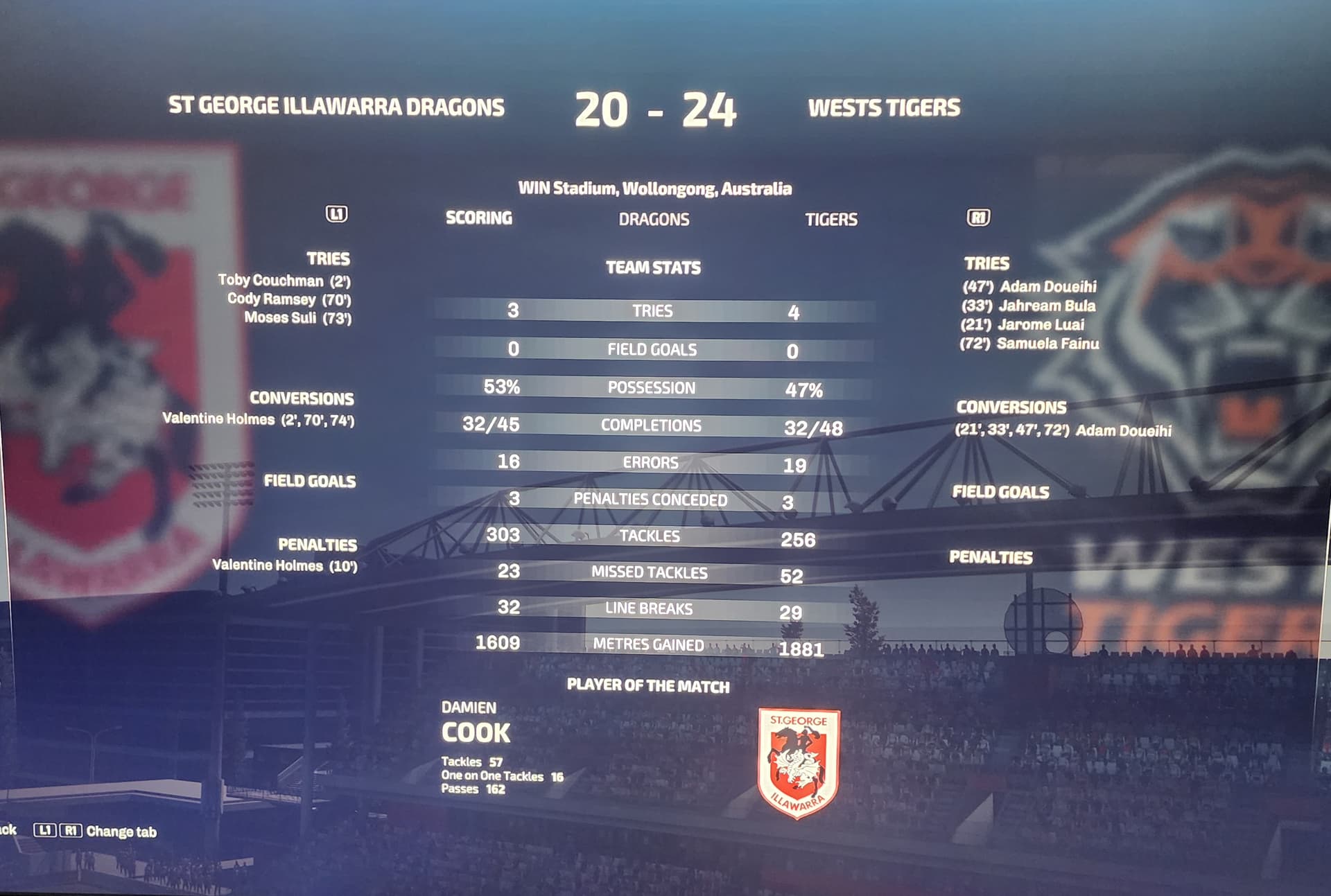 I hope this is the right place to pop these incidents I encountered this morning. If it makes any difference, I was playing an NRL season game in Amateur mode, and I only ever play against the AI.