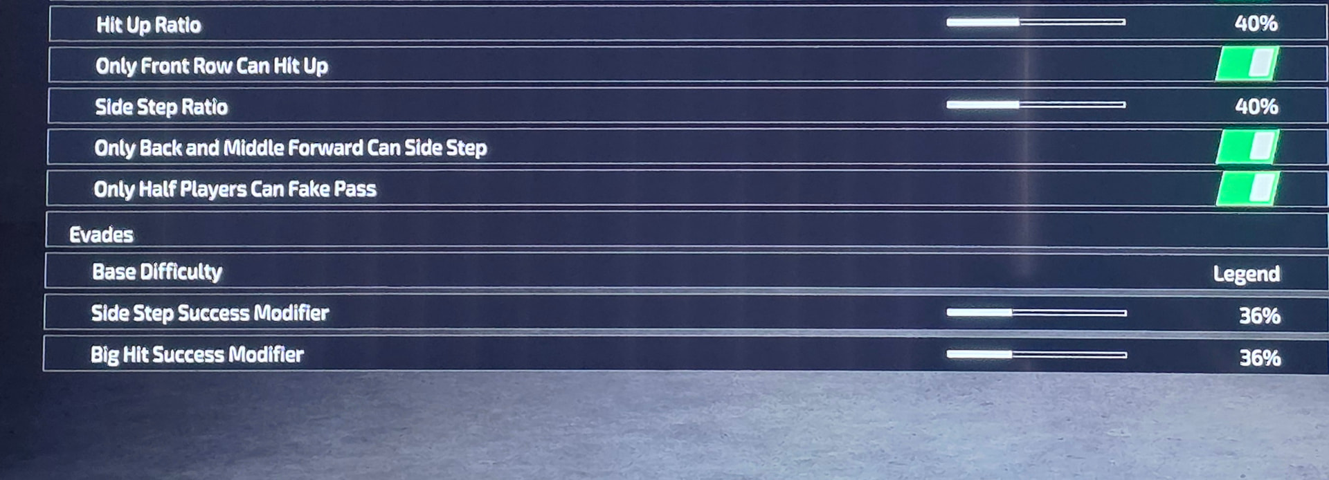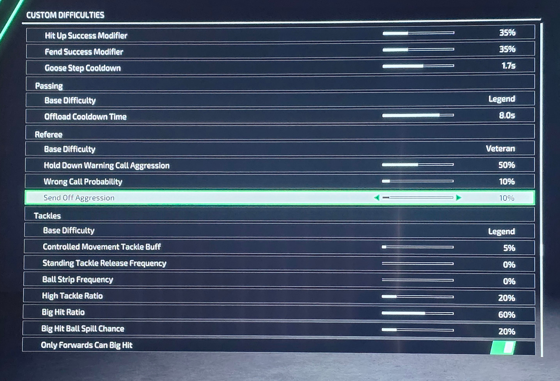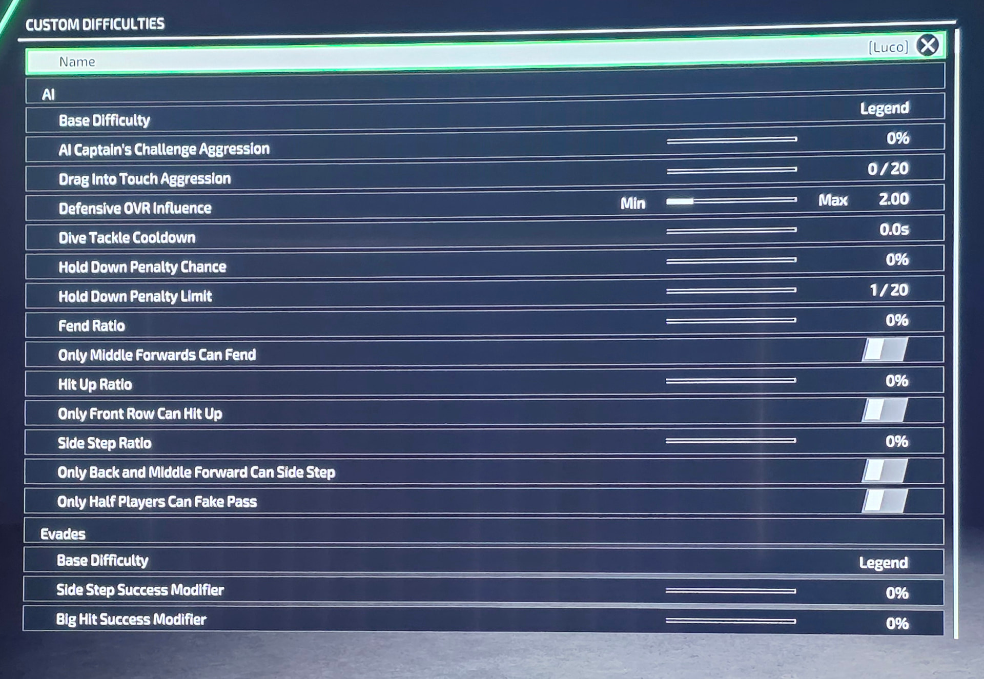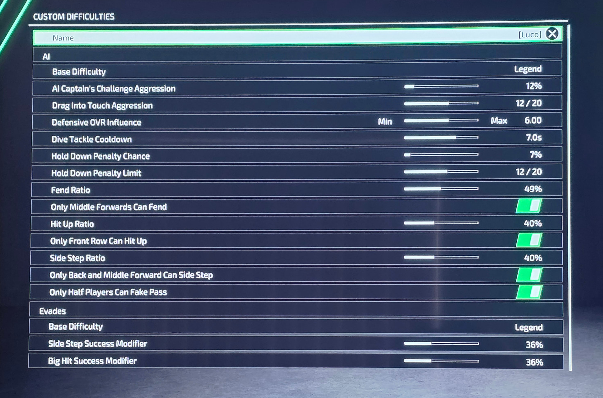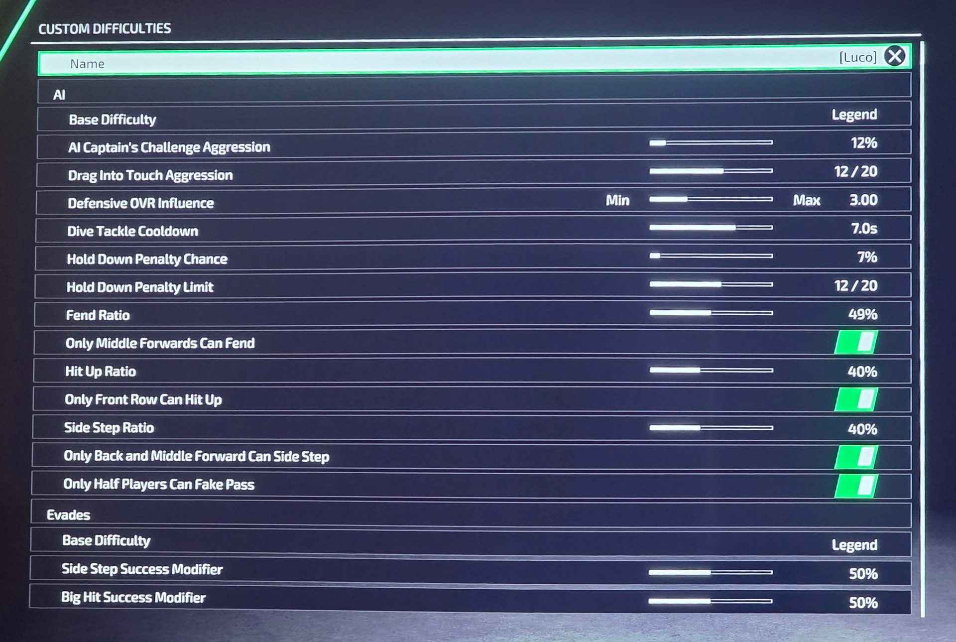 No it is way harder. I expect you are correct. I am still playing around with the custom settings. Just finished another half with some different settings against the same Souths team. It has gotten a bit more competitive but i still have 0 missed tackles compared to their 28. I am going to put the changes in the original post. Just need to find what effects my ability to make every tackle then i think i will have the game as best as i can get it.