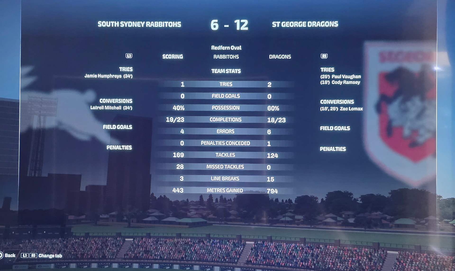 What i noticed was Melbourne scored 6 of the tries came from a metre or 2 out where i could only get 1 defender into the tacke as the others just looked on doing nothing or were retreating back to the dead ball line. Everytime i got a player over the line but from close out the AI managed to get 2 or 3 into the tackle and roll me over resulting in no tries. They still have a long way to go to get this anywhere near looking like a decent game. It seems to always be 1 step forward 2 steps back way of doing things. I have also noticed the game plays differently when you play now than it does when you play a custom game of a comp. On play now your custom match settings actually work as opposed to it all just reverts back to NRL rules in a custom comp. I expect if they are trialling their fixes using play now they aren’t getting a realistic look at it from a custom comp perspective.