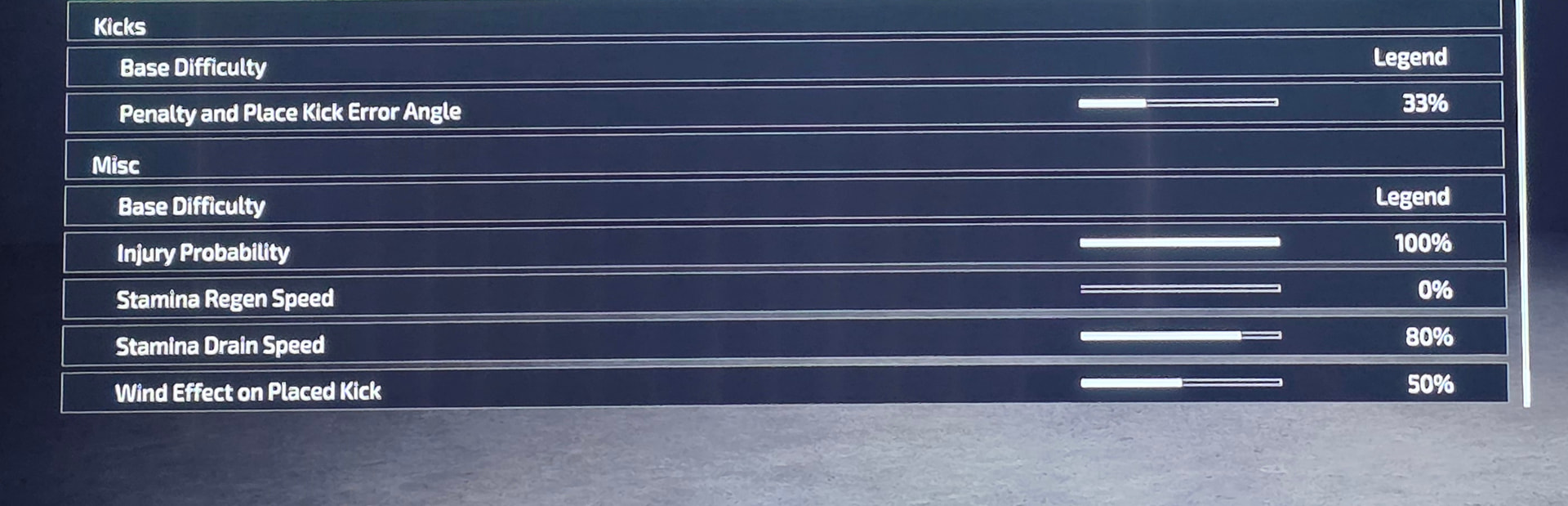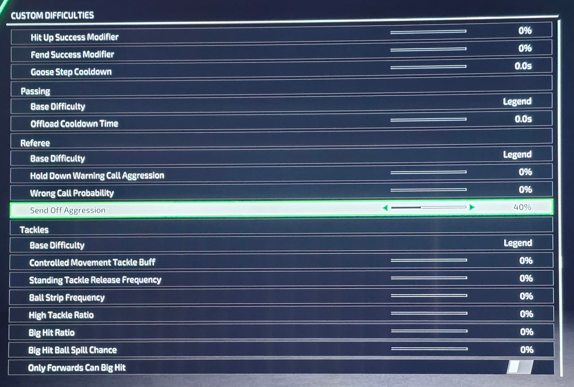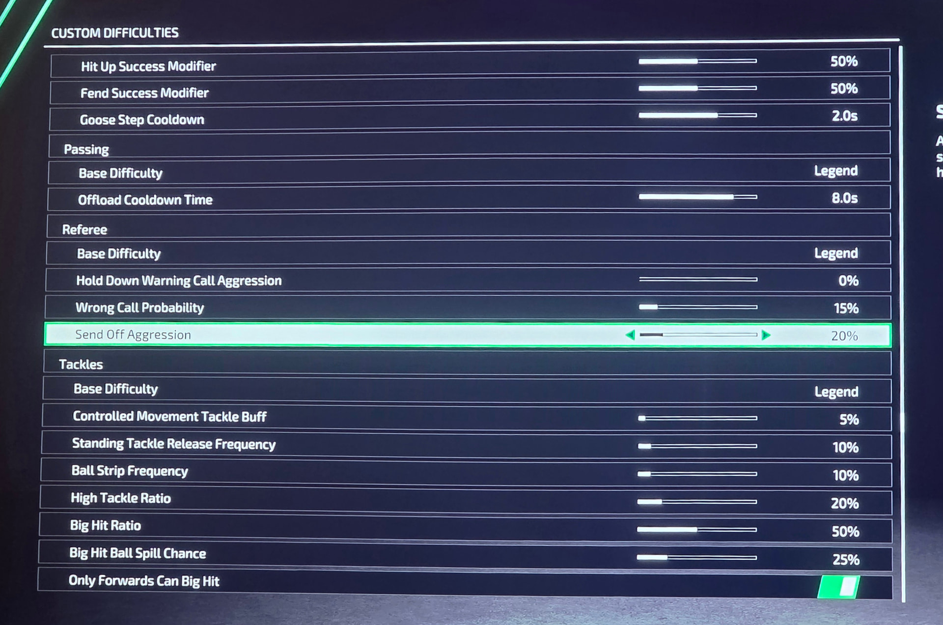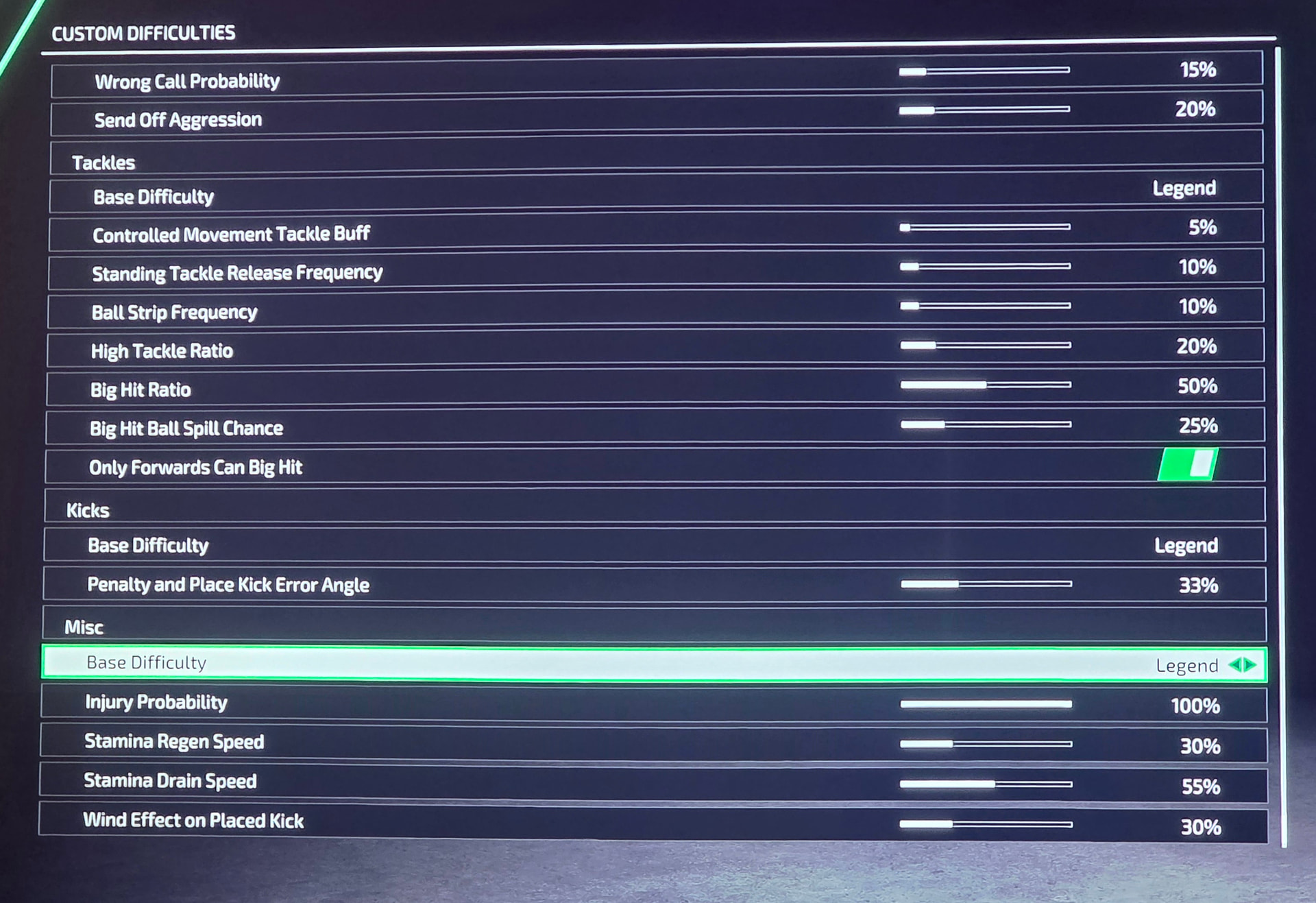 Anyway looks like i either just keep playing with my custom difficulties and never missing a tackle, the last game i dropped the tackle skills of all my players by 5 and still never missed any which now make twelve 70 minute games of not missing any or i change the skills of my players to be better than the opposition and play the preset pro mode so i can compete and have an unrealistic amount of missed tackles.