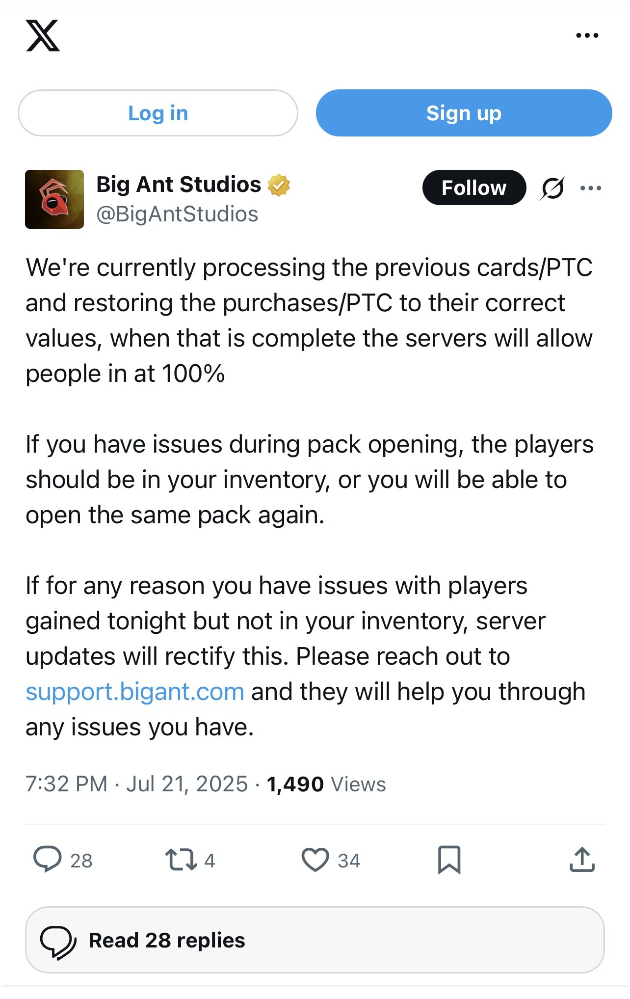 Didn’t get to keep my 6 unopened packs because the game was bugging on launch day and wasn’t letting me open packs. Was keen to hopefully open them tonight but they aren’t there. Also no coins thats were promised. Spent money on those packs. Didn’t get to open them. Come on big ant