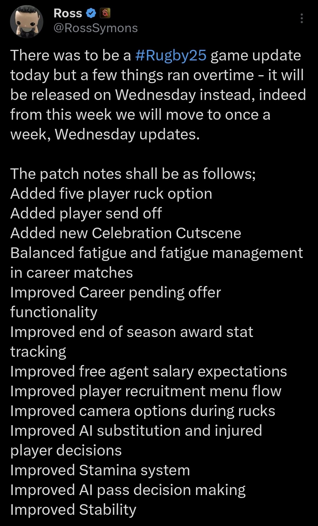 Hopefully it is good, I do think the 5 to a ruck is positive, I just hope the rucking minigame or whatever gets altered too, for example, timing becomes more important. No point committing 5 to a ruck and one player bulldozes over them. Also, I hope they adjust positioning too, I can see picking and going with the 9 becoming OP if they dont adjust it with the 5 in a ruck. The rest, lets just hope AI passing isnt down the list for a reasonâŠ