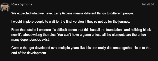 The worst is, we are only getting 1 update per week now, which is 4 per month and when there is an âupdateâ, nothing changes and the game goes backwards. Need a second weekly update just to fix what the first update broke. Alternatively, one weekly update on the big fixes and another update on smaller additions and fixes, including content. One broken update a week and this game will never be finished Unbelievable to think that so little is done on a weekly basis. I would recommend Ross gets hands-on with this game.