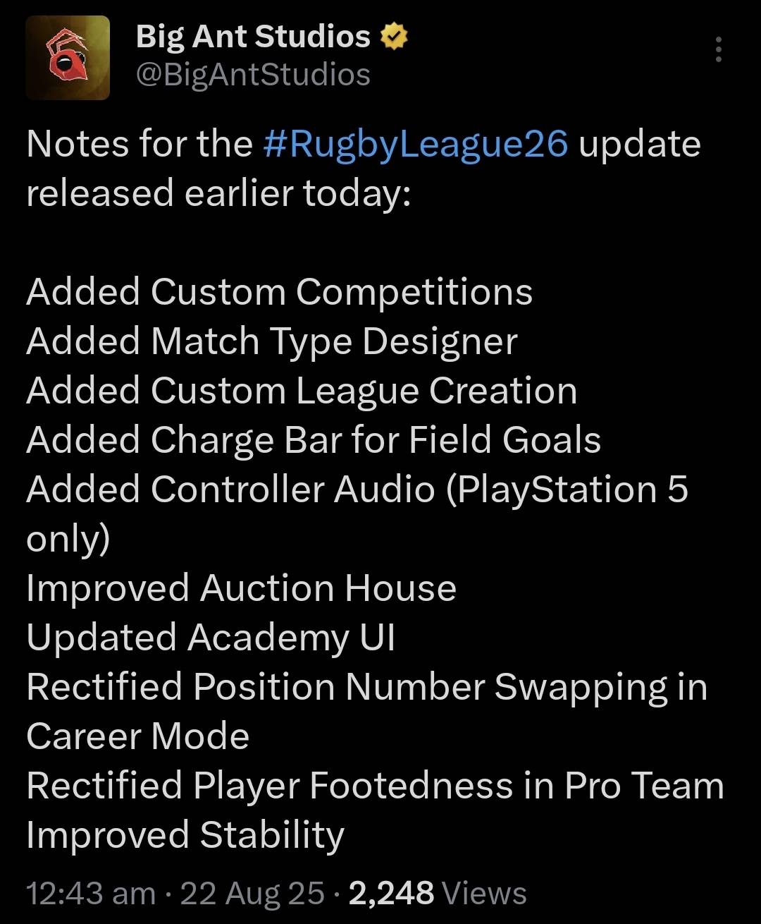 We need sliders and more frequent patches. Rugby League 26 Is getting all the attention right now and they have no problem testing frequent updates. The team on Rugby 25 must be miniscule compared to the resources RL26 is getting.