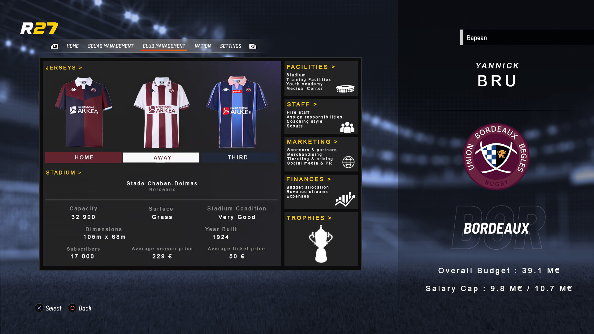 In my opinion, club management and customisation are very limited in Rugby 25. There is no real club budget system: you mainly get a transfer budget to sign players, and even that is not very clear or visual, which makes financial management feel shallow.