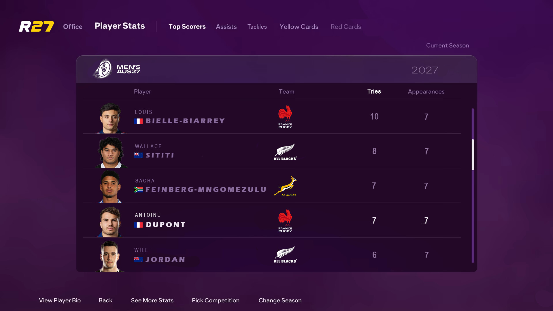 Competition statistics deserve to be a fully developed category, not just a side menu. Rugby 25 has the basics, but this could be expanded into a proper analysis and immersion tool: